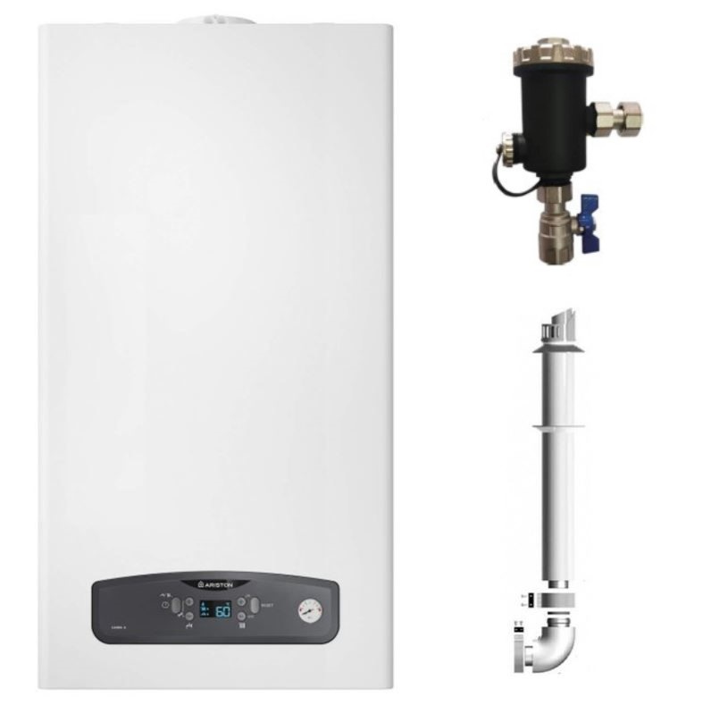 Centrala termica in condensatie Ariston Cares S 24 kW, kit evacuare inclus si Filtru AntimagnetitaAriston Cares S 24 kWCentralele termice murale in condensatie din gama Cares S de la Ariston reprezinta o solutie eficienta atat pentru furnizarea de apa calda menajera, cat si pentru incalzirea spatiilor rezidentiale. Cazanul Cares se distinge prin consumul redus fata de centralele din generatiile anterioare, gratie tehnologiei in condensatie.Economie si eficientCentrala termica Ariston din gama Cares S foloseste tehnologia moderna in condensare optimizata, oferind cu pana la 35% economie de combustibil fata de vechea generatie.Silentiozitate si confortUnitatea Ariston Cares S are o noua structura si amortizor de zgomot optimizate special pentru a fi in armonie cu casa ta.Control simpluOperarea centralei termice murale Cares S este foarte simpla si intuitiva. Gratie interfetei usor de inteles si a displayului LCD, poti regla parametrii centralei in functie de nevoile tale.CARACTERISTICI SI AVANTAJETehnologiei in condensare - pompa complet modulanta si schimbator de caldura a.c.m din otel inoxidabil, centralele termice Ariston se caracterizeaza prin emisii reduse, incadrandu-se in acest fel in clasa NOx 5.Functie anti-inghet - centrala termica este echipata cu functie impotriva inghetului care se activeaza la temperaturi mai mici de 8°C.Eficienta energetica - datorita tehnologiei moderne in condensare optimizate si capacitatii de functionare modulanta, sistemul Cares S este foarte economic. Domeniul de modulatie poate ajunge pana la 1:5.Afisaj LCD - panoul de comanda incorporeaza un ecran iluminat cu un meniu simplu, intuitiv si usor de citit pe baza de pictograme, pentru afisarea temperaturii si presiunii din instalatie, respectiv codurile de eroare. Montarea centralei termice Ariston - este facila si rapida. Dimensiunile compacte si ergonomice permit instalarea centralei Cares in orice spatiu (dulap, baie, bucatarie, etc.).Echipamentele din seria S - au un grad de protectie electrica IPX5D. IP (Ingress Protection Code) este un indice care masoara cat de bine este protejat un dispozitiv atat de obiecte solide, cat si de lichide indiferent de directie.Clasa energetica ErP - ofera posibilitatea unei eficiente energetice ridicate A+, impreuna cu accesoriile optionale de termoreglare Ariston.DOTARI STANDARD - Functie Auto - Pompa complet modulanta - Manometru frontal - Structura noua optimizata - Afisaj LCD - Raport de modulare 1:5 - Amortizor de zgomot - Schimbator de caldura a.c.m din otel inoxidabil - Functie Anti-inghet - Ventilator cu turatie variabila - Senzor de presiune minima - Functie pentru aerisirea instalatiei - Protectia electrica clasa IPX5D - Tubulatura 25 m pentru 50 mmPARTI COMPONENTE ARISTON CARES S 24 kW 1. Evacuare gaze 2. Schimbator primar 3. Automat aprindere (interior PCB) 4. Flansa arzator 5. Ventilator 6. Mixer 7. Vana gaz 8. Sifon condens 9. Silencer10. Conducta scurgere condens11. ElectrodNOU - PANOU DE COMANDA1. Regim functionare vara / iarna2. Butoane temperatura ACM3. Display4. Butoane temperatura Incalzire5. Buton reset6. ManometruNOUTATI TEHNICE - SCHIMBATORUL DE CALDURA- Pe evacuare exista un senzor montat pentru evitarea supraincalzirii schimbatorului si a sistemului de evacuare.-In parametrul 834 este posibil sa severifice temperatura masurata de acest senzor.- Daca senzorul de evacuare gaze este deteriorat ( deschis sau scurtcircuitat), afisajul arata eroarea 605. Eroarea dispare atunci cand senzorul retransmite valori normale.- Exista, de asemenea, o termosiguranta care se deschide daca temperatura evacuarii este mai mare de 133°C, centrala intra in eroarea 101. Termosiguranta este disponibila ca piesa de schimb.DIMENSIUNIA. TurB. Iesire ACM C. Gaz D. Intrare apa rece E. ReturSPECIFICATII TEHNICE