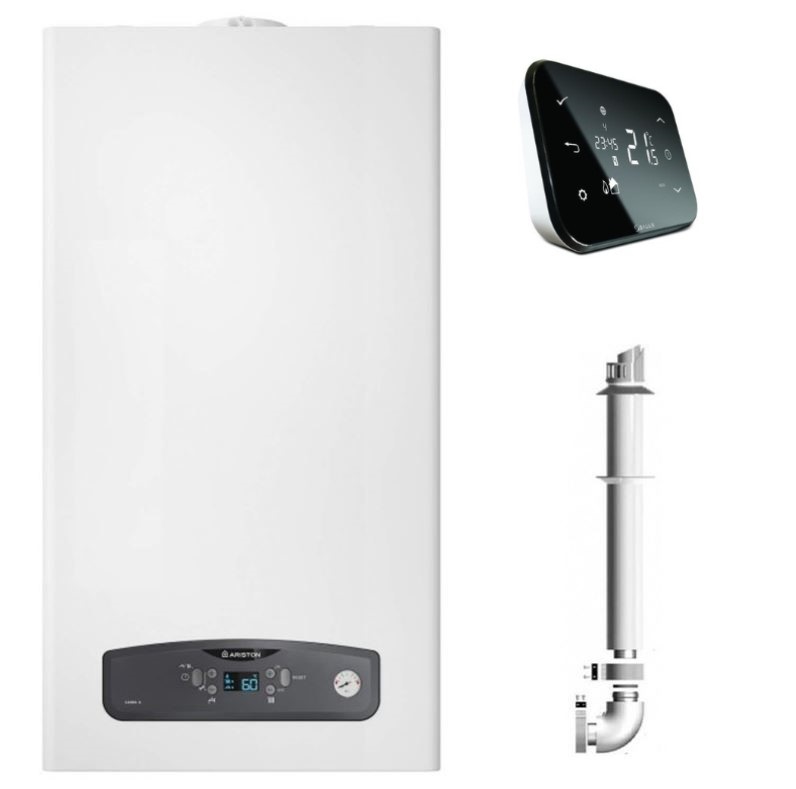 Centrala termica in condensatie Ariston Cares S 30 kW, kit evacuare inclus si Salus IT500 wifi termostat ambient cu control prin internetAriston Cares S 30 kWCentralele termice murale in condensatie din gama Cares S de la Ariston reprezinta o solutie eficienta atat pentru furnizarea de apa calda menajera, cat si pentru incalzirea spatiilor rezidentiale. Cazanul Cares se distinge prin consumul redus fata de centralele din generatiile anterioare, gratie tehnologiei in condensatie.Economie si eficientCentrala termica Ariston din gama Cares S foloseste tehnologia moderna in condensare optimizata, oferind cu pana la 35% economie de combustibil fata de vechea generatie.Silentiozitate si confortUnitatea Ariston Cares S are o noua structura si amortizor de zgomot optimizate special pentru a fi in armonie cu casa ta.Control simpluOperarea centralei termice murale Cares S este foarte simpla si intuitiva. Gratie interfetei usor de inteles si a displayului LCD, poti regla parametrii centralei in functie de nevoile tale.CARACTERISTICI SI AVANTAJETehnologiei in condensare - pompa complet modulanta si schimbator de caldura a.c.m din otel inoxidabil, centralele termice Ariston se caracterizeaza prin emisii reduse, incadrandu-se in acest fel in clasa NOx 5.Functie anti-inghet - centrala termica este echipata cu functie impotriva inghetului care se activeaza la temperaturi mai mici de 8°C.Eficienta energetica - datorita tehnologiei moderne in condensare optimizate si capacitatii de functionare modulanta, sistemul Cares S este foarte economic. Domeniul de modulatie poate ajunge pana la 1:5.Afisaj LCD - panoul de comanda incorporeaza un ecran iluminat cu un meniu simplu, intuitiv si usor de citit pe baza de pictograme, pentru afisarea temperaturii si presiunii din instalatie, respectiv codurile de eroare. Montarea centralei termice Ariston - este facila si rapida. Dimensiunile compacte si ergonomice permit instalarea centralei Cares in orice spatiu (dulap, baie, bucatarie, etc.).Echipamentele din seria S - au un grad de protectie electrica IPX5D. IP (Ingress Protection Code) este un indice care masoara cat de bine este protejat un dispozitiv atat de obiecte solide, cat si de lichide indiferent de directie.Clasa energetica ErP - ofera posibilitatea unei eficiente energetice ridicate A+, impreuna cu accesoriile optionale de termoreglare Ariston.DOTARI STANDARD - Functie Auto - Pompa complet modulanta - Manometru frontal - Structura noua optimizata - Afisaj LCD - Raport de modulare 1:5 - Amortizor de zgomot - Schimbator de caldura a.c.m din otel inoxidabil - Functie Anti-inghet - Ventilator cu turatie variabila - Senzor de presiune minima - Functie pentru aerisirea instalatiei - Protectia electrica clasa IPX5D - Tubulatura 25 m pentru 50 mmPARTI COMPONENTE ARISTON CARES S 30 kW 1. Evacuare gaze 2. Schimbator primar 3. Automat aprindere (interior PCB) 4. Flansa arzator 5. Ventilator 6. Mixer 7. Vana gaz 8. Sifon condens 9. Silencer10. Conducta scurgere condens11. ElectrodNOU - PANOU DE COMANDA1. Regim functionare vara / iarna2. Butoane temperatura ACM3. Display4. Butoane temperatura Incalzire5. Buton reset6. ManometruNOUTATI TEHNICE - SCHIMBATORUL DE CALDURA- Pe evacuare exista un senzor montat pentru evitarea supraincalzirii schimbatorului si a sistemului de evacuare.-In parametrul 834 este posibil sa severifice temperatura masurata de acest senzor.- Daca senzorul de evacuare gaze este deteriorat ( deschis sau scurtcircuitat), afisajul arata eroarea 605. Eroarea dispare atunci cand senzorul retransmite valori normale.- Exista, de asemenea, o termosiguranta care se deschide daca temperatura evacuarii este mai mare de 133°C, centrala intra in eroarea 101. Termosiguranta este disponibila ca piesa de schimb.DIMENSIUNIA. TurB. Iesire ACM C. Gaz D. Intrare apa rece E. ReturSPECIFICATII TEHNICE