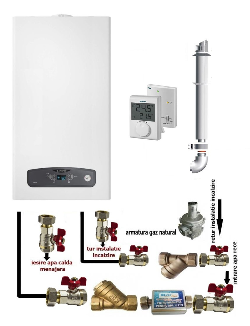 Centrala termica pe gaz in condensare Ariston CARES S 30 kW, clasa A, LCD, model nou, termostat ambient si pachet instalarePachetul contine produsele de mai jos:1.Centrala termica pe gaz in condensare Ariston CARES S 30 kW2.Termostat digital neprogramabil fara fir Siemens RDH100RF3. Kit de armaturi pentru montaj Regulator gaz cu filtru 3/4 - 1 buc Filtru Y 1/2 - 1 buc Filtru Y 3/4 - 1 buc Filtru magnetic anticalcar 1/2""- 1 buc Robinet de trecere cu olandez 1/2 Filet interior - 3 bucati Robinet de trecere cu olandez 3/4 Filet interior- 3 bucati Niplu alama 1/2 - 3 BUC Niplu alama 3/4 - 3 BUCAriston Cares S 30 kWCentralele termice murale in condensatie din gama Cares S de la Ariston reprezinta o solutie eficienta atat pentru furnizarea de apa calda menajera, cat si pentru incalzirea spatiilor rezidentiale. Cazanul Cares se distinge prin consumul redus fata de centralele din generatiile anterioare, gratie tehnologiei in condensatie.Economie si eficientCentrala termica Ariston din gama Cares S foloseste tehnologia moderna in condensare optimizata, oferind cu pana la 35% economie de combustibil fata de vechea generatie.Silentiozitate si confortUnitatea Ariston Cares S are o noua structura si amortizor de zgomot optimizate special pentru a fi in armonie cu casa ta.Control simpluOperarea centralei termice murale Cares S este foarte simpla si intuitiva. Gratie interfetei usor de inteles si a displayului LCD, poti regla parametrii centralei in functie de nevoile tale.CARACTERISTICI SI AVANTAJETehnologiei in condensare - pompa complet modulanta si schimbator de caldura a.c.m din otel inoxidabil, centralele termice Ariston se caracterizeaza prin emisii reduse, incadrandu-se in acest fel in clasa NOx 5.Functie anti-inghet - centrala termica este echipata cu functie impotriva inghetului care se activeaza la temperaturi mai mici de 8°C.Eficienta energetica - datorita tehnologiei moderne in condensare optimizate si capacitatii de functionare modulanta, sistemul Cares S este foarte economic. Domeniul de modulatie poate ajunge pana la 1:5.Afisaj LCD - panoul de comanda incorporeaza un ecran iluminat cu un meniu simplu, intuitiv si usor de citit pe baza de pictograme, pentru afisarea temperaturii si presiunii din instalatie, respectiv codurile de eroare. Montarea centralei termice Ariston - este facila si rapida. Dimensiunile compacte si ergonomice permit instalarea centralei Cares in orice spatiu (dulap, baie, bucatarie, etc.).Echipamentele din seria S - au un grad de protectie electrica IPX5D. IP (Ingress Protection Code) este un indice care masoara cat de bine este protejat un dispozitiv atat de obiecte solide, cat si de lichide indiferent de directie.Clasa energetica ErP - ofera posibilitatea unei eficiente energetice ridicate A+, impreuna cu accesoriile optionale de termoreglare Ariston.DOTARI STANDARD - Functie Auto - Pompa complet modulanta - Manometru frontal - Structura noua optimizata - Afisaj LCD - Raport de modulare 1:5 - Amortizor de zgomot - Schimbator de caldura a.c.m din otel inoxidabil - Functie Anti-inghet - Ventilator cu turatie variabila - Senzor de presiune minima - Functie pentru aerisirea instalatiei - Protectia electrica clasa IPX5D - Tubulatura 25 m pentru 50 mmPARTI COMPONENTE ARISTON CARES S 30 kW 1. Evacuare gaze 2. Schimbator primar 3. Automat aprindere (interior PCB) 4. Flansa arzator 5. Ventilator 6. Mixer 7. Vana gaz 8. Sifon condens 9. Silencer10. Conducta scurgere condens11. ElectrodNOU - PANOU DE COMANDA1. Regim functionare vara / iarna2. Butoane temperatura ACM3. Display4. Butoane temperatura Incalzire5. Buton reset6. ManometruNOUTATI TEHNICE - SCHIMBATORUL DE CALDURA- Pe evacuare exista un senzor montat pentru evitarea supraincalzirii schimbatorului si a sistemului de evacuare.-In parametrul 834 este posibil sa severifice temperatura masurata de acest senzor.- Daca senzorul de evacuare gaze este deteriorat ( deschis sau scurtcircuitat), afisajul arata eroarea 605. Eroarea dispare atunci cand senzorul retransmite valori normale.- Exista, de asemenea, o termosiguranta care se deschide daca temperatura evacuarii este mai mare de 133°C, centrala intra in eroarea 101. Termosiguranta este disponibila ca piesa de schimb.DIMENSIUNIA. TurB. Iesire ACM C. Gaz D. Intrare apa rece E. ReturSPECIFICATII TEHNICE