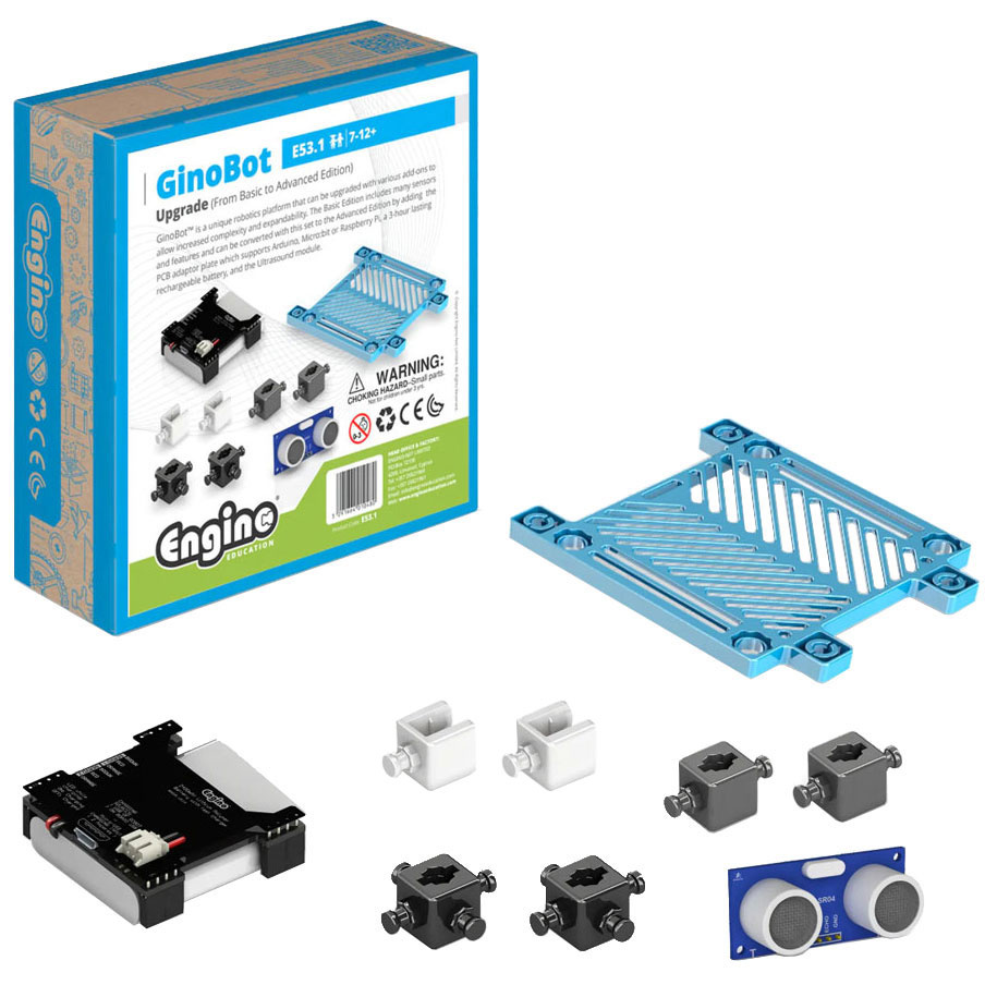Transformă GinoBot cu kitul de expansiune Engino. Adaugă compatibilitate Arduino, Micro:bit, Raspberry Pi, baterie și senzor ultrasunete.