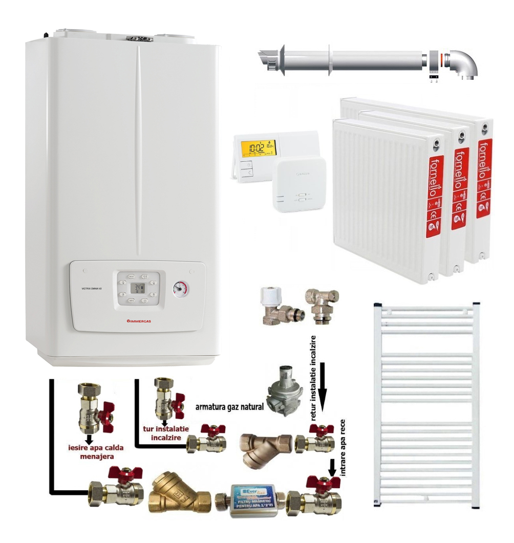 Pachet complet încălzire apartament 2 camere cu centrală Immergas Victrix Omnia 26, calorifere și accesorii. Montaj rapid și eficiență maximă.