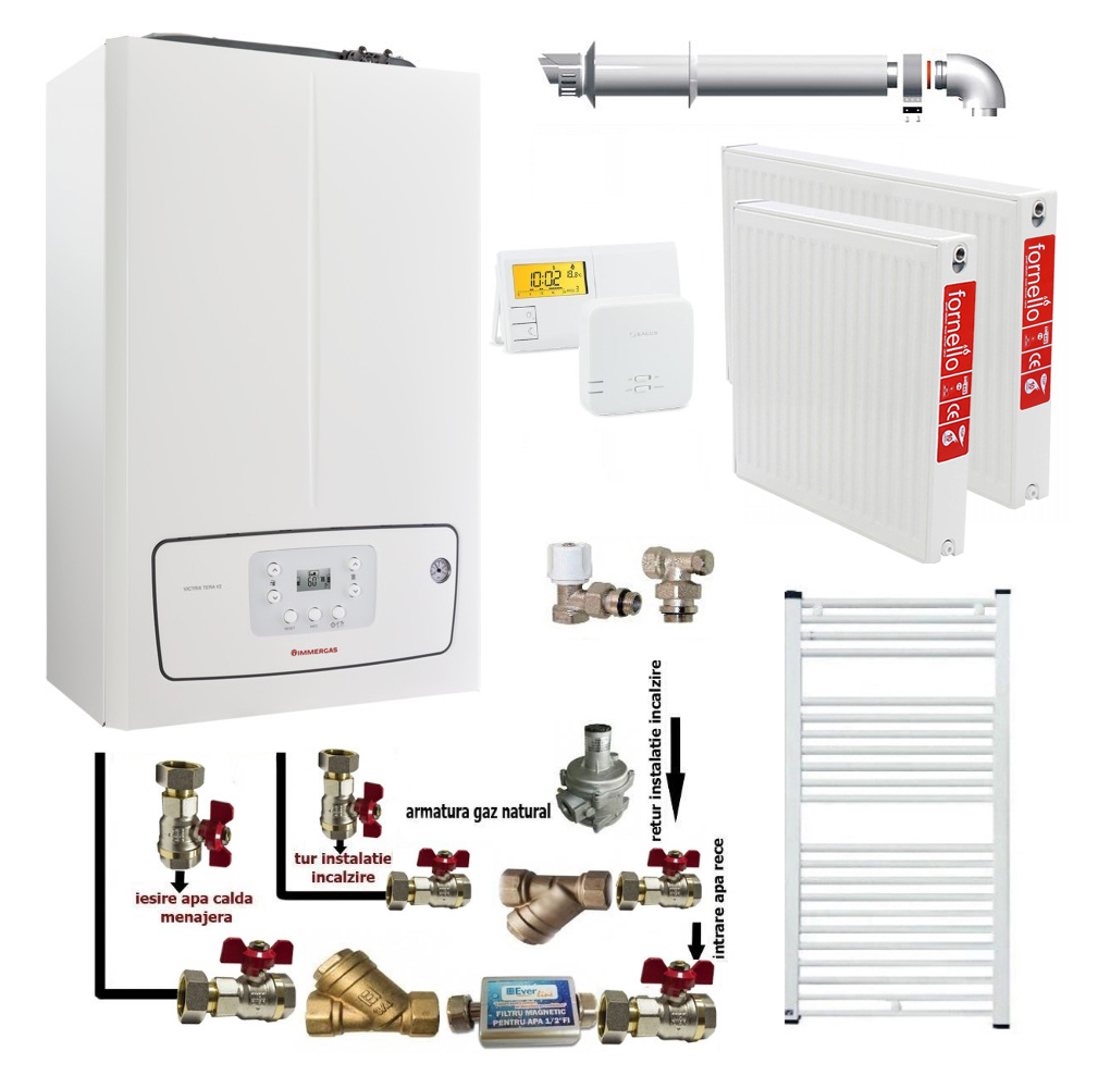 Pachet complet cu centrala in condensare Immergas Victrix TERA 24kW. Ideal pentru apartamente, include calorifere, termostat si kit montaj.