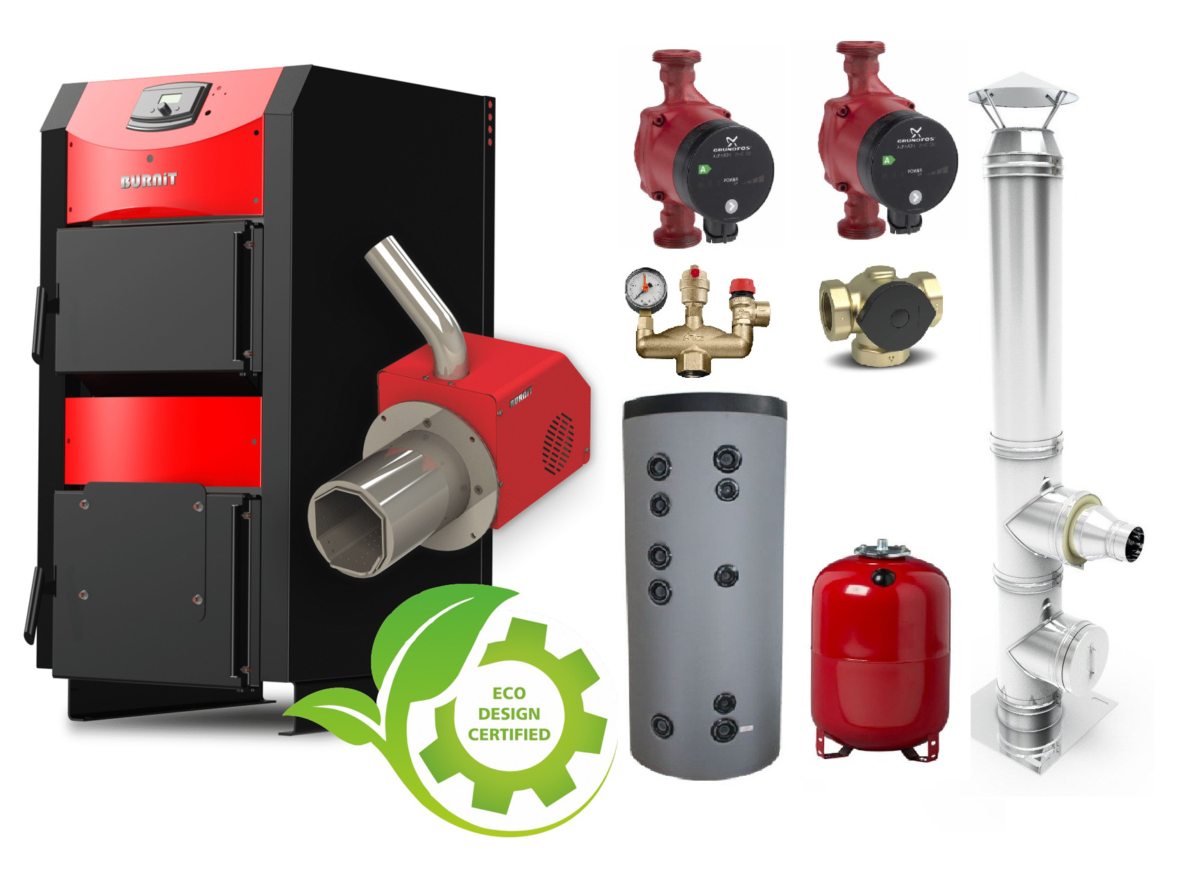Pachet complet centrală mixtă Burnit 30 kW cu arzător peleti, boiler 150L, pompe Grundfos. Ideal pentru case până la 200mp.