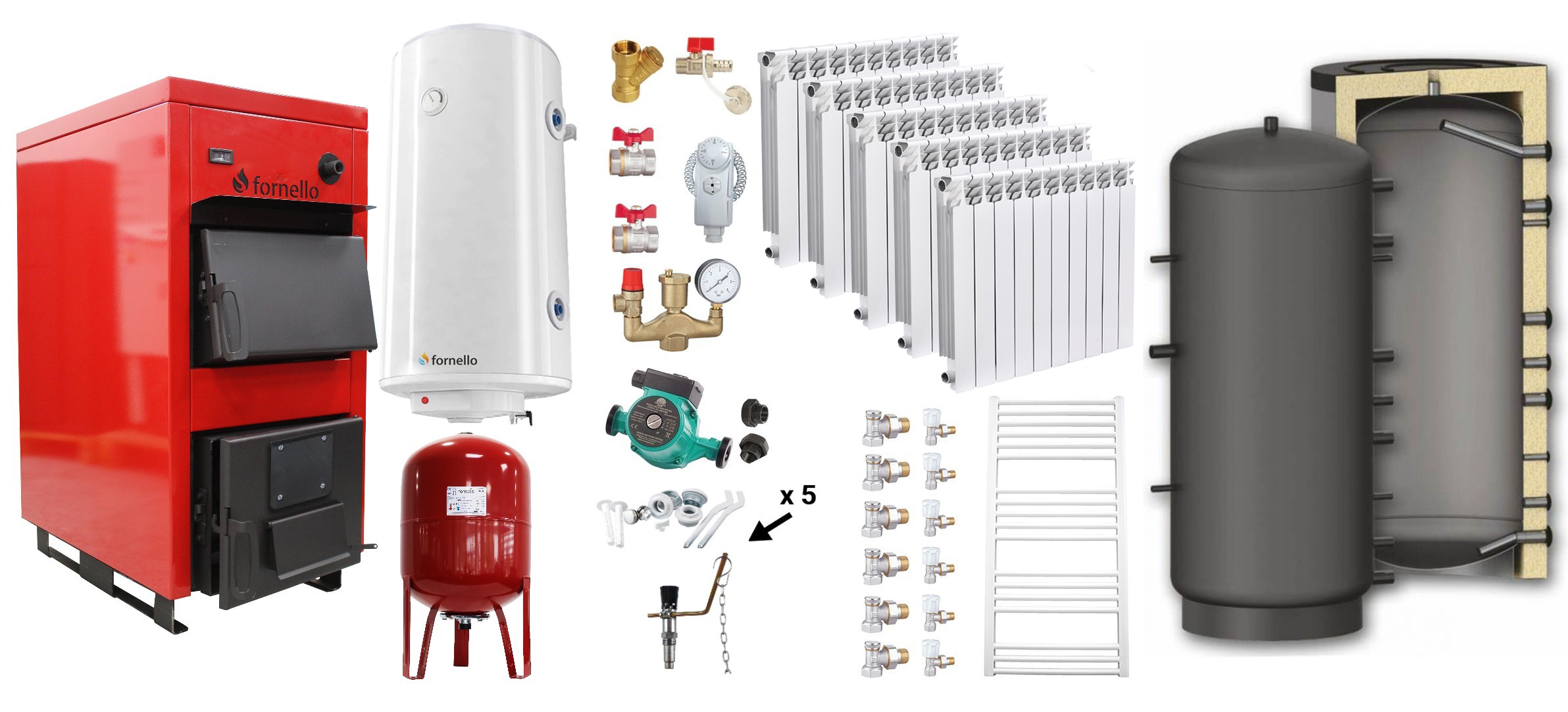 Pachet complet centrală pe combustibil solid Fornello 25kW cu puffer 800L, calorifere aluminiu, boiler și accesorii montaj. Economisește la încălzire!