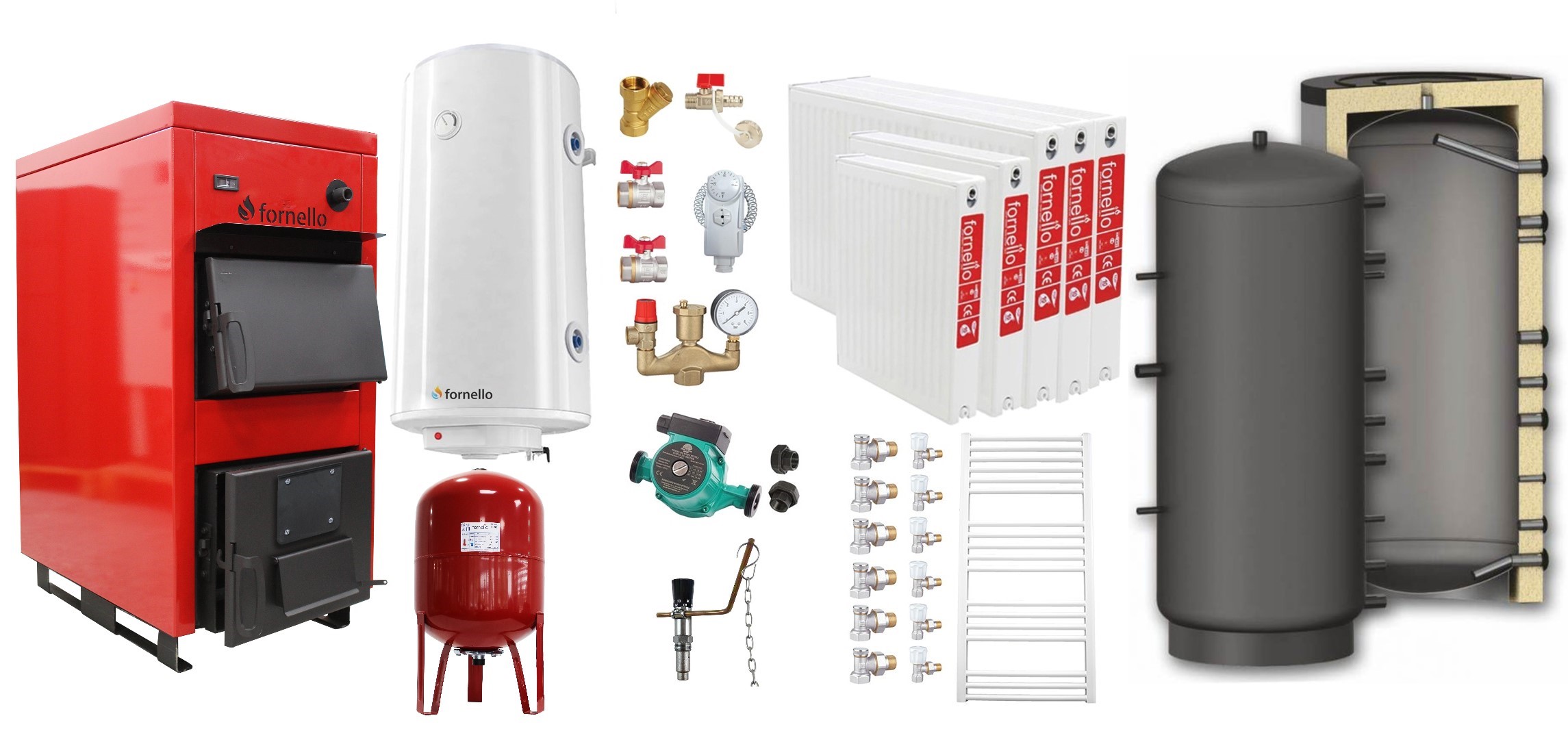 Pachetul include toate componentele esențiale pentru o instalație funcțională: centrala Fornello Eco Energy WB de 35 kW, puffer Sunsystem P 1000, 6 radiatoare din oțel cu dimensiuni variate, boiler termoelectric cu o serpentină, vas de expansiune de 80 litri, pompă de circulație și kitul de montaj. Sistemul poate încălzi eficient spații de până la 200 de metri pătrați.