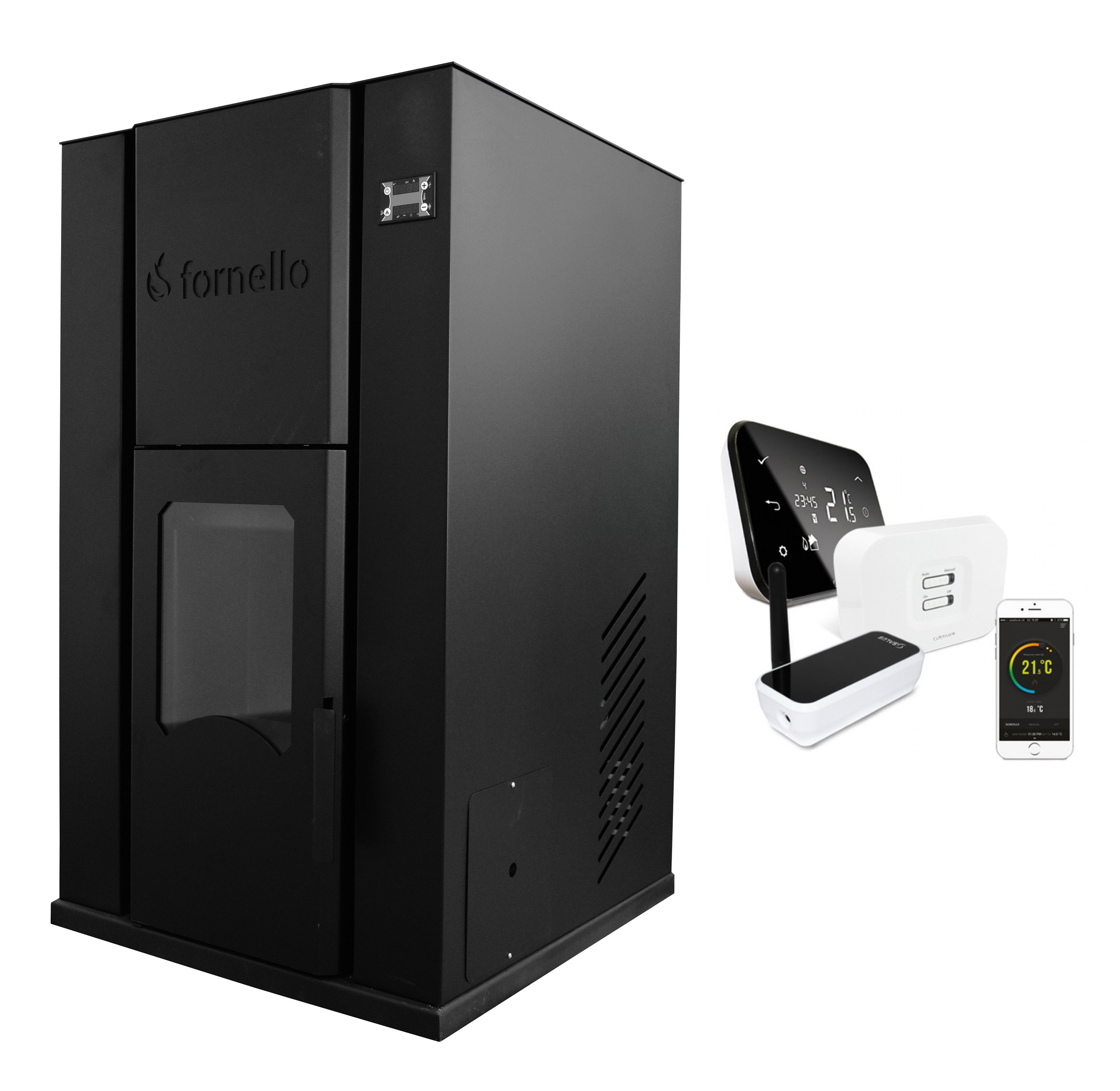 Pachet complet termosemineu pe peleti Fornello Pellet King 35kw cu termostat Wi-Fi. Eficienta A+, autonomie pana la 96h. Livrare rapida!