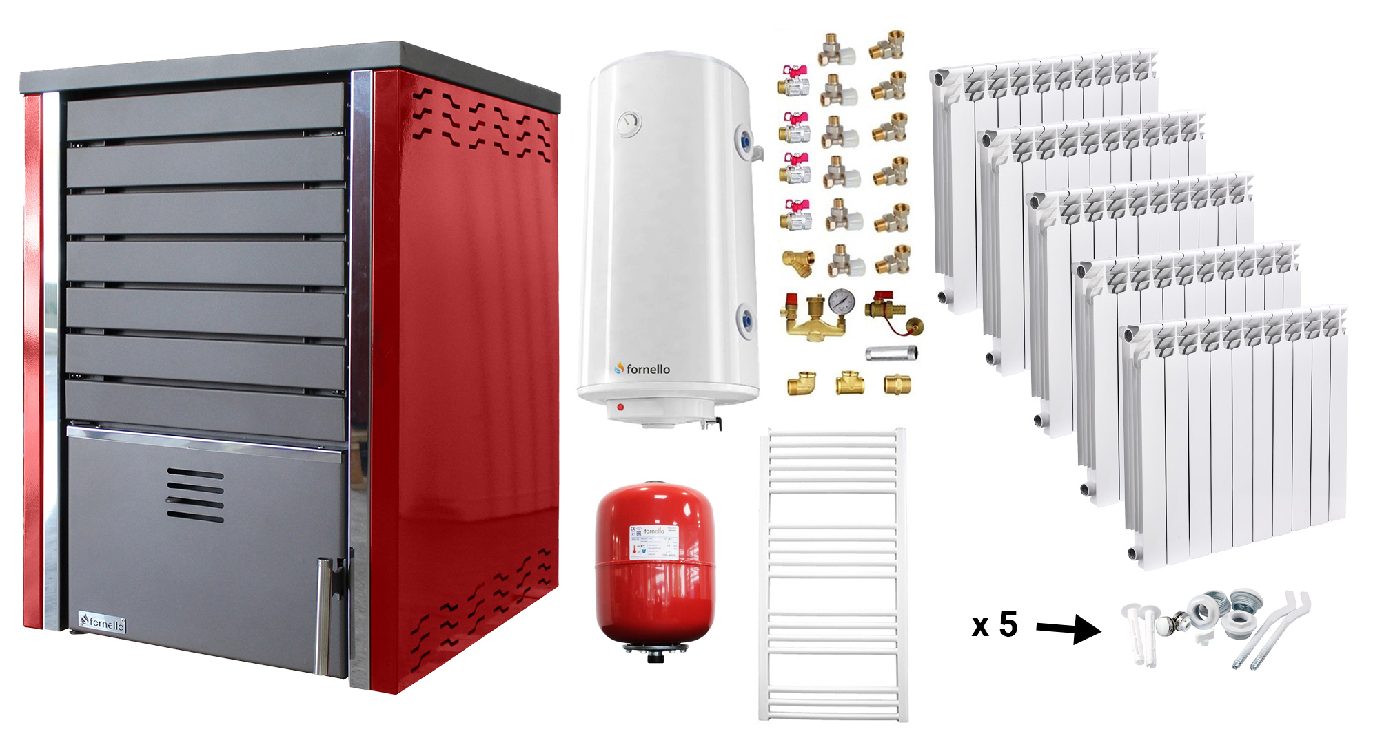 Pachet complet încălzire: centrală pe lemne Fornello SAUNA 30kw, calorifere aluminiu, boiler 100l. Livrare rapidă!