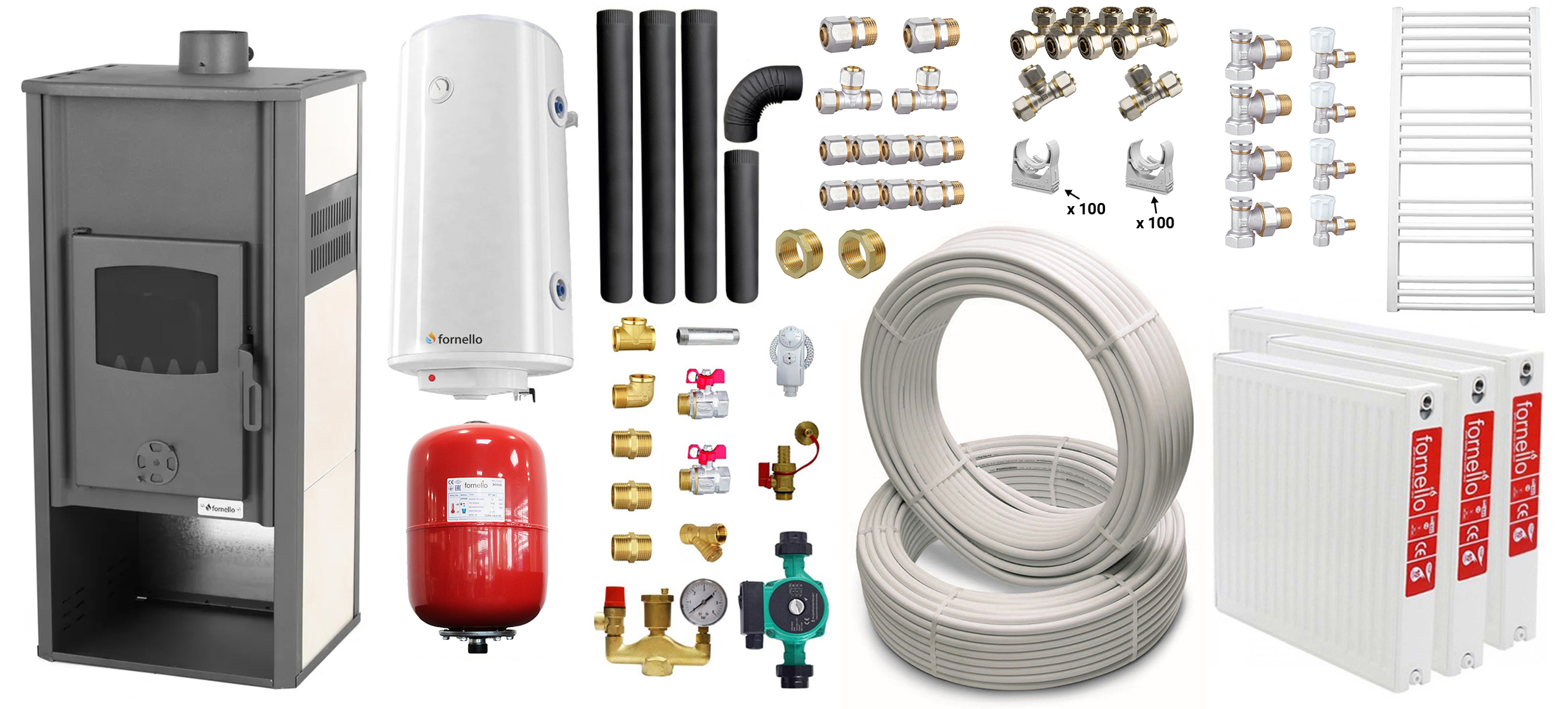 Soluție completă încălzire și apă caldă cu termosemineu Fornello 22kW. Include radiatoare, boiler 100L și instalare.