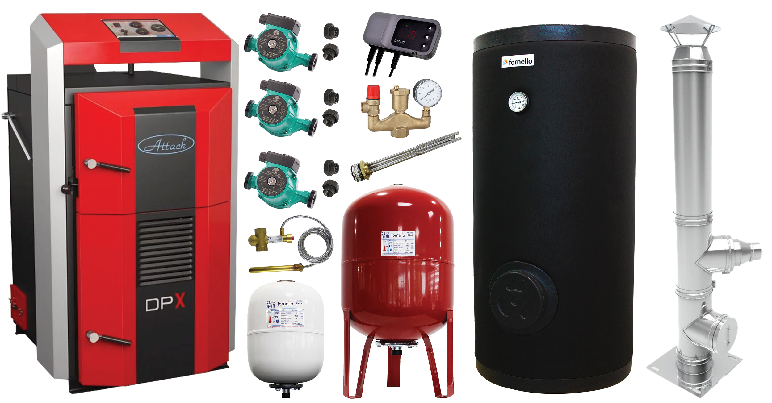 Pachet premium centrală termică Attack DPX 45kW cu gazeificare, cos inox, boiler 150L, 3 pompe, control digital. Eficiență până la 91%