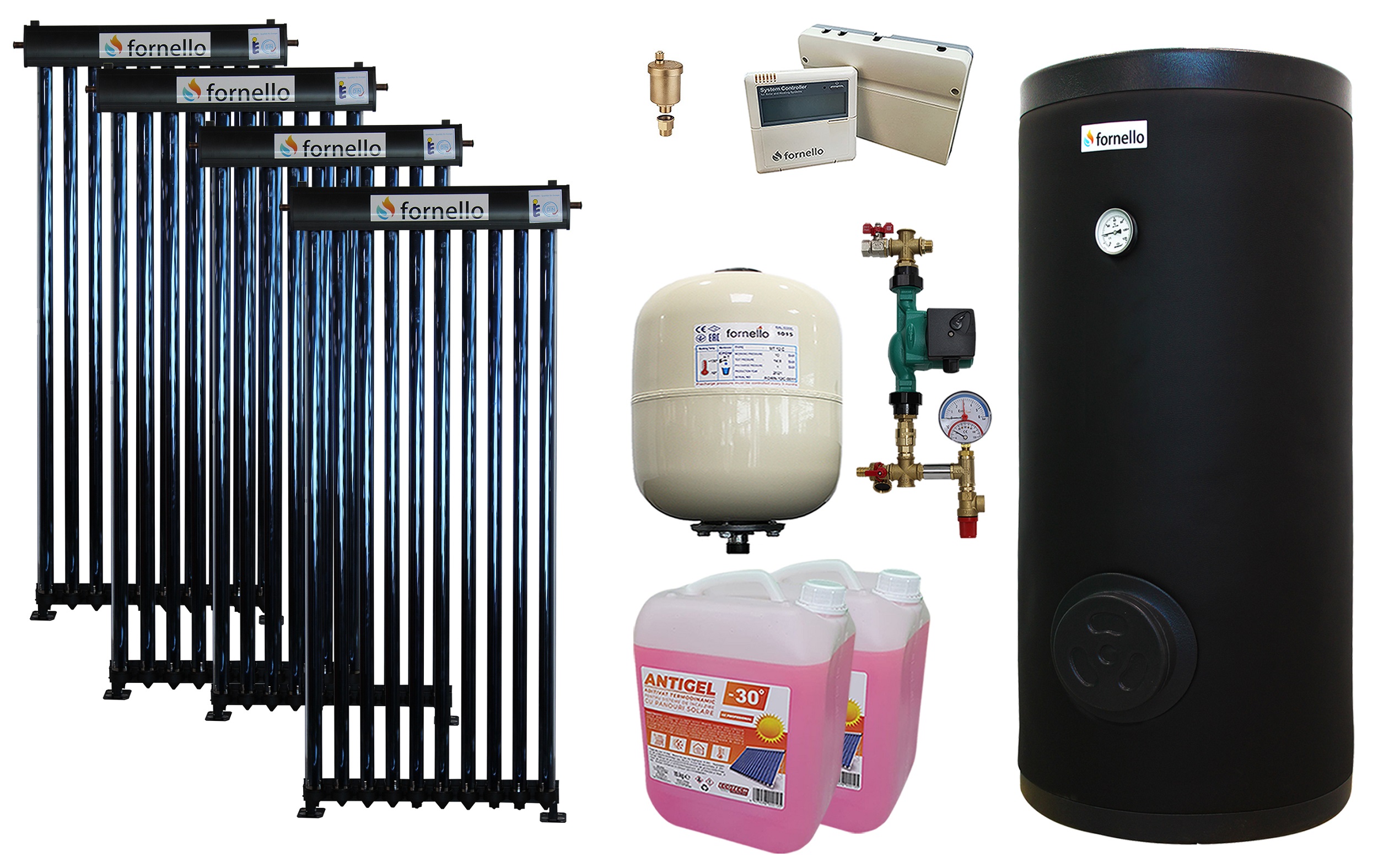 Sistem solar complet Fornello cu 40 tuburi heat pipe, boiler 300L 2 serpentine. Economie 80% la APA CALDĂ. Livrare rapidă.