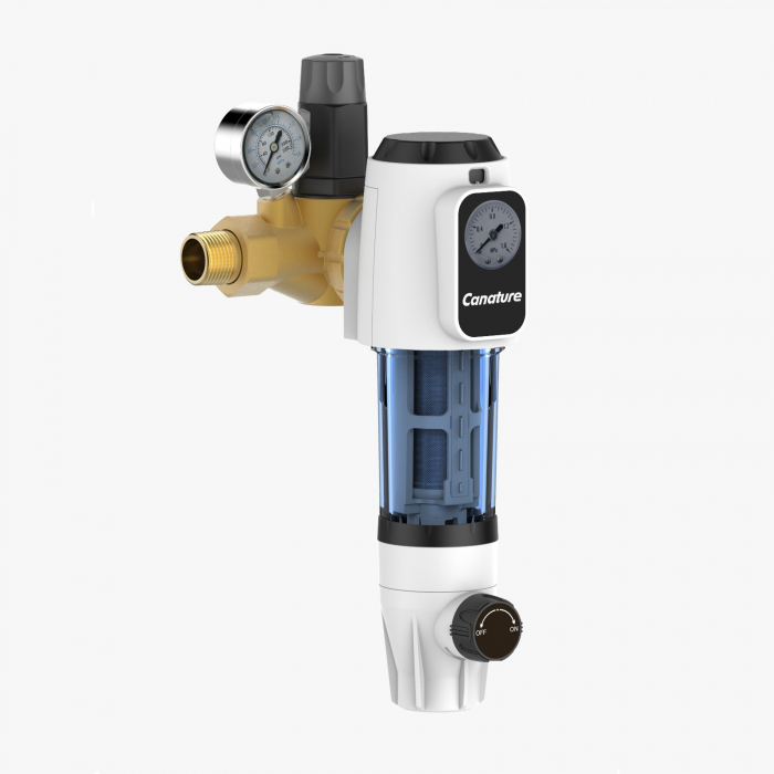 Prefiltru apa Canature L cu sita inox, manometru si regulator presiune. Protejează-ți instalatia si aparatele electrocasnice. Comandă acum!