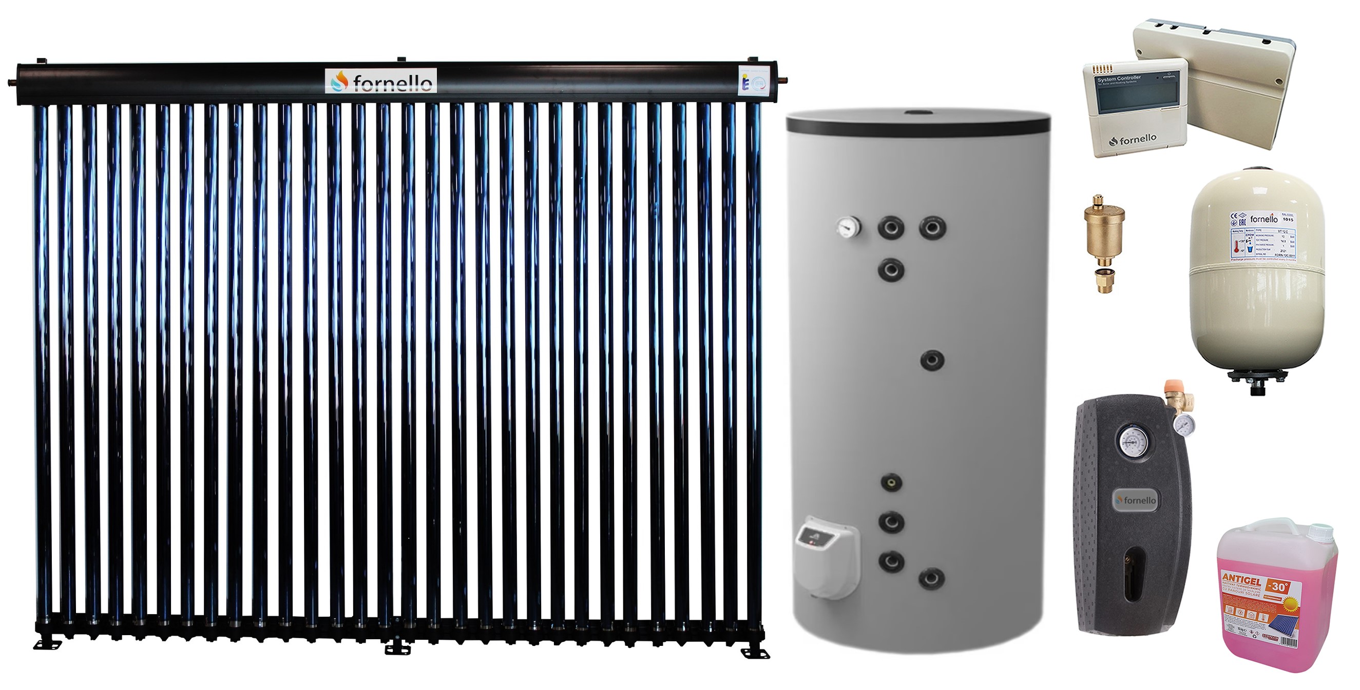 Sistem solar presurizat Fornello cu 30 tuburi heat pipe și boiler 200L. Economisește 80% la apa caldă. Livrare completă cu controller și accesorii.
